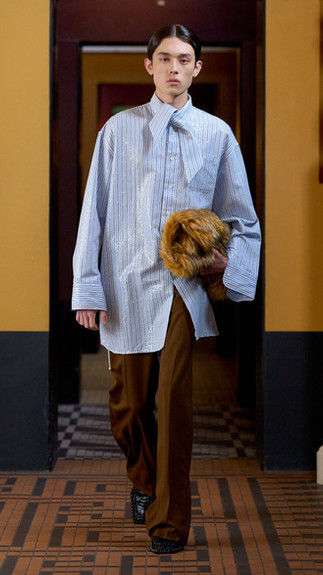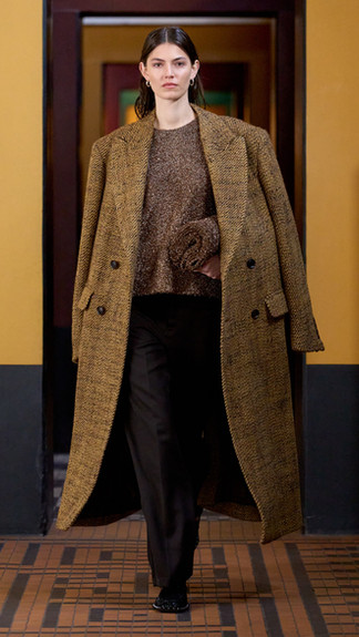 The outerwear stole the show, with coats and jackets that exuded an effortless, oversized coolness. Single-breasted suits played with proportion, featuring Barrymore collars that added an air of aristocratic nonchalance. Meanwhile, the tactile extravagance of faux fur toppers and soft, draped jumpers introduced a sense of ease to the structured tailoring, making this collection not only effortlessly chic but oozing with comfort too.
