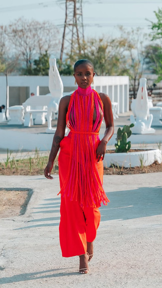 Texture played a central role in this collection. Fringe detailing swayed in long, playful strips or clustered into rhythmic layers. This was present in many of the looks and it emulated the fluid movement of the isigege. The effect was fluid and it turned every step that the models took into a dance. From structured tops paired with fringed minis to cropped jackets, flowy dresses, bold co-ords, the signature Malondié swimsuits, kimonos, jumpsuits, each design pulses with personality in its own very special way.