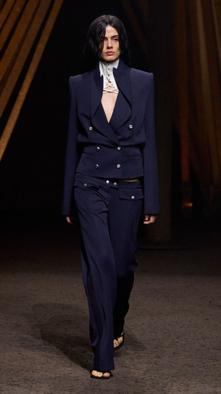McGirr balanced rigidity and release throughout the collection. Corseted waists and sharply tailored jackets were counteracted with voluminous dresses that billowed like captured wind. He revisited Lee McQueen’s iconic bumster trouser, re-engineering it in sleek navy wool with daringly low waistlines and serpentine zippers, grounding the ethereal energy in something instinctive and urban. The tailoring was exquisite but intentionally imperfect, lapels crumpled, seams frayed, taking over the collection with a rawness that felt deeply human.