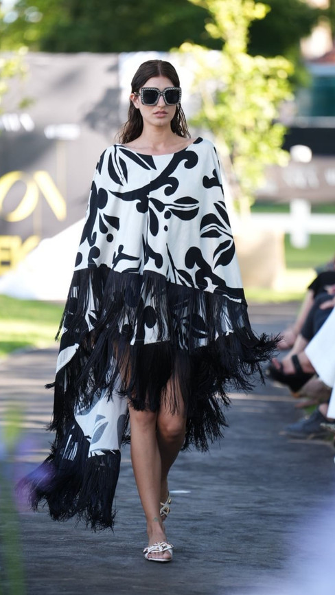 The collection featured a mix of floral prints, knitted materials and fringe details that created a textured and layered look. The colour palette balanced delicate creams, stark whites and black, giving the designs a neutral yet striking look. Silhouettes ranged from flowing kaftans to coordinated two-piece sets and detailed dresses.