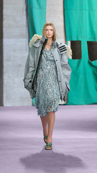 And finally, Jacquemus approached a similar tactic, trimming feathers down the sides of the white trousers and patched on the large skirts. With polka dots and bananas being the main motifs of the La Croisiere collection, plummages were repeated in refined ways. Closing the show was a monstrous coat, paired with a matching skirt, materialized from thin furry strands in a light beige.