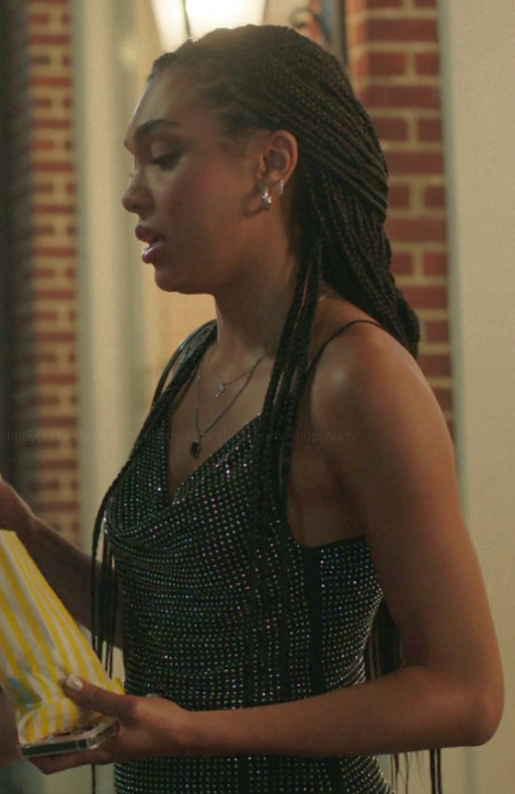 Shimmering like moonlight on water, Anika’s green cowl-neck dress was an inspired choice for Belly’s bachelorette festivities. The rich emerald tone, paired with a sparkling green bag, radiates calm confidence and empathy, qualities that define Anika’s role as a steadfast friend. The fluid fabric and beaming sparkle make this a dream dress for warm summer evenings.